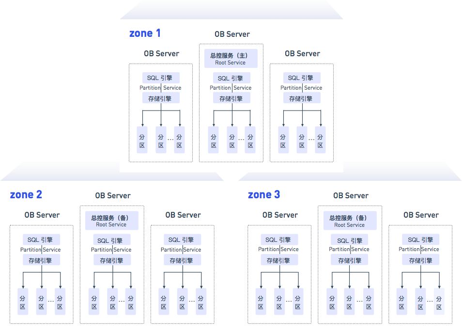 OceanBase本身是一个分布式的集群,通常情况下是多副本的存储。所以一般会分为三个子集群,每一个子集群叫做一个zone。一个zone里有多个节点和服务器组成,我们管它叫OBServer。对于每一个分区,在整个集群内它都有三个副本。