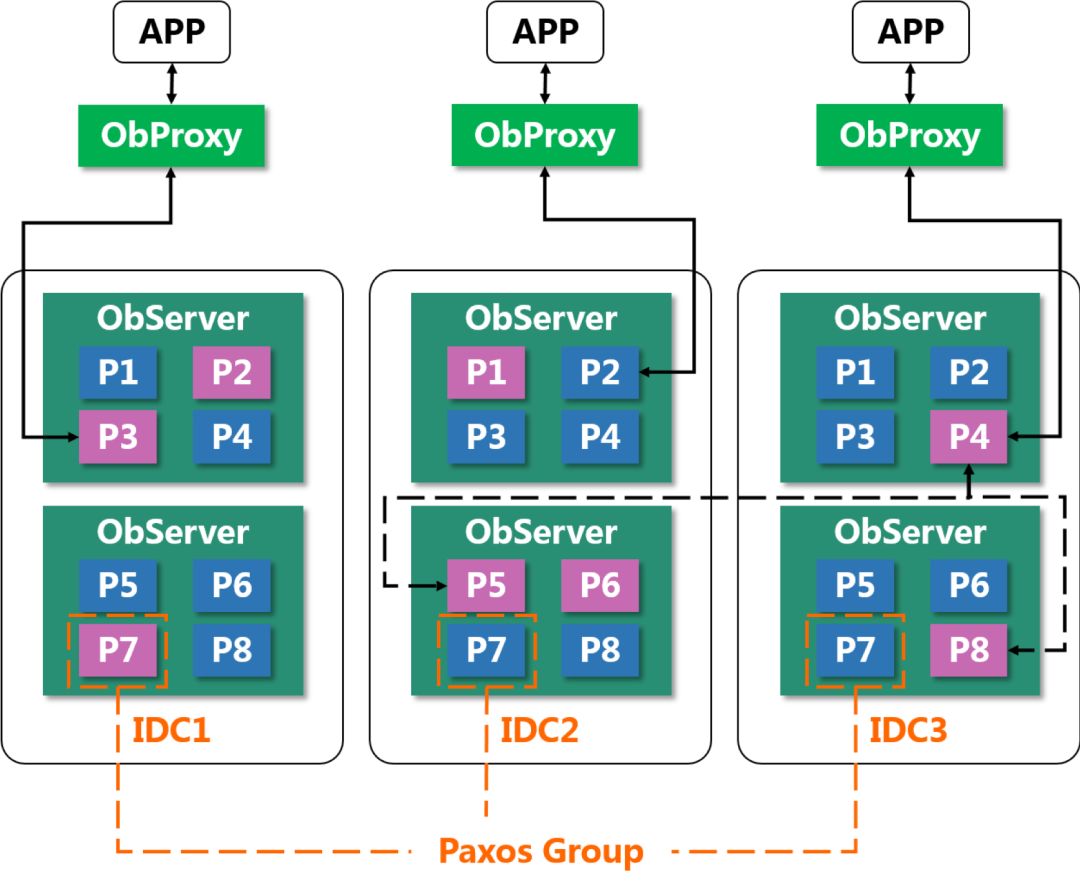 另外值得一提的是,OceanBase支持的Paxos协议。Paxos协议本身相对复杂,但是其哲学思想是非常简单的,就是一个多数派投票协议。比如一个事情,A认为成功,B认为成功 ,C认为不成功,根据多数派协议认定这个事情最后是成功的。那么具体到这里,这三个分区的一主两备,就形成了Paxos协议的成员组。