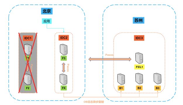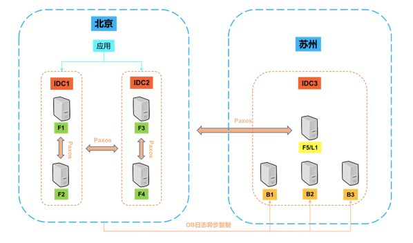 所以我们在这个基础上,做了这么一个方案:就是在两个机房同时也是两座城市,分别放上,如上图所示在北京放上4个副本,在苏州放1个副本,然后形成一个OB的业务集群。那么平时客户的应用在北京的集群这边进行访问。然后在苏州,我们其实还有三个备份副本。