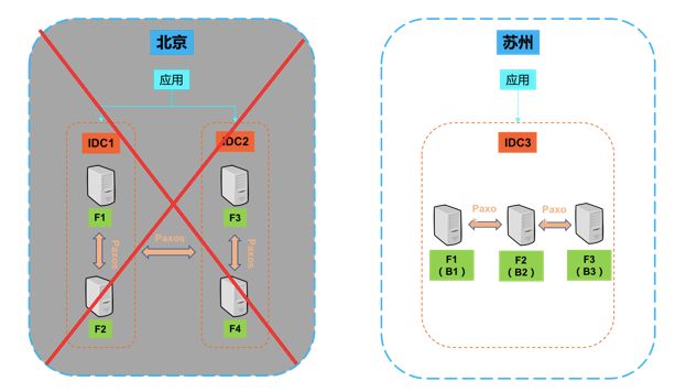 如果北京的两个机房都发生灾难,垮掉了,那么我们会做一个接管的操作,把这三个备份副本升级成一个全功能副本构成一个新的集群,然后为业务提供服务。