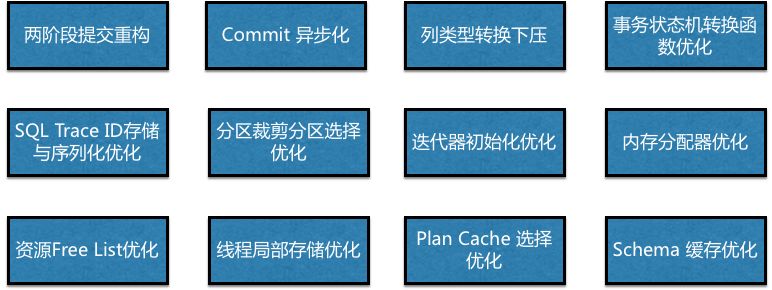 OceanBase 2.0版本进行了深度的优化获得了很好的性能提升。上图所列的只是其中一部分优化工作。性能优化是一个事无巨细的工作,有点类似于测试工作,本质上每一行代码都会影响系统的性能。