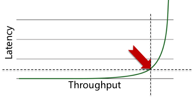 根据排队论模型,这两者之间的关系如图中所示:随着吞吐量增加,延迟近似指数倍增长。