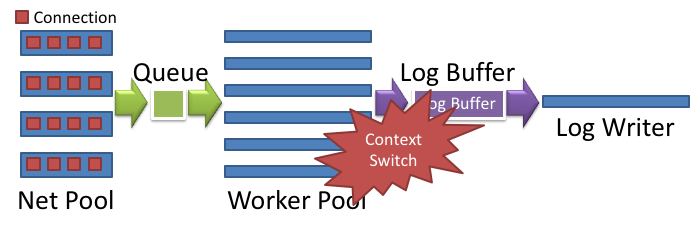 对于SQL语句的执行,这已经是一个很好的模型了。但是对于事务的提交操作,需要将日志在本地持久化和发送到其他副本持久化,提交操作又会使得工作线程出现等待的情况。