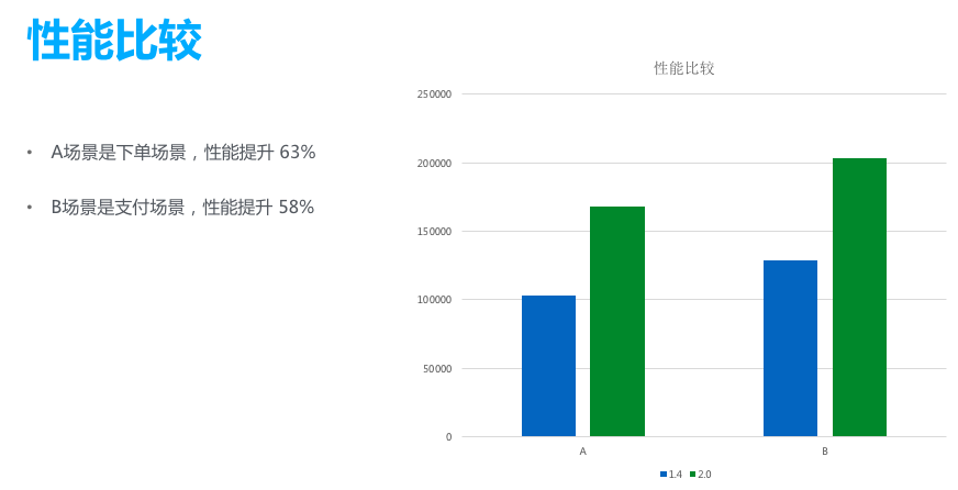 最后结果是:在下单场景下,OceanBase 2.0版本比1.4版本的性能提升了63%,在支付场景下,提升了58%。