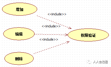 主要是用例间的包含,箭头指向的方向为被包含的用例,简单的说,就是如果我要执行A用例,那么就会执行到B用例,如: