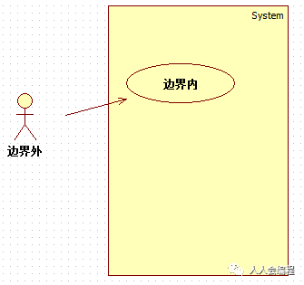 系统边界是指系统与系统的界限,边界外表示参与者,边界内表示系统内部组成,如: