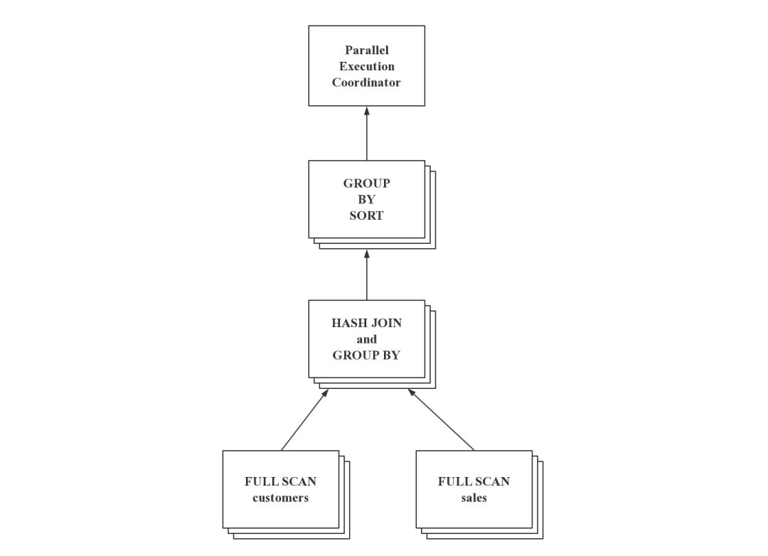 上图是为该查询生成的一种并行计划[4],一共划分了 4 个子计划,最底层是对 customers、sales 基表的扫描,中间两层节点对数据做分组和聚集运算。