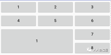 <GridLayout android:layout_width="match_parent" android:layout_height="match_parent" android:rowCount="3" //指定行数 android:columnCount="3" //指定列数 xmlns:android="http://schemas.android.com/apk/res/android" > <Button android:layout_columnWeight="1" // 实现平均分布 android:text="1" /> <Button android:layout_columnWeight="1" android:text="1" /> <Button android:layout_columnWeight="1" android:text="1" /> <Button android:layout_columnWeight="1" android:text="1" /> <Button android:layout_columnWeight="1" android:text="1" /> <Button android:layout_columnWeight="1" android:text="1" /> <Button android:layout_rowSpan="2" //跨行 android:layout_columnSpan="2" //跨列 android:layout_columnWeight="1" android:text="1" android:layout_height="95dp" /> <Button android:layout_width="wrap_content" android:layout_height="wrap_content" android:layout_columnWeight="1" android:text="1" /> <Button android:layout_columnWeight="1" android:text="1" /> <Button android:layout_columnWeight="1" android:text="1" /> </GridLayout> </RelativeLayout>