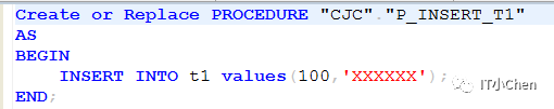 CREATE OR REPLACE PROCEDURE p_insert_t1ASBEGININSERT INTO t1 values(100,'XXXXXX');END;/