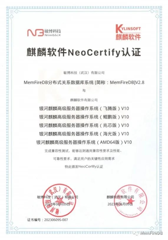 近日,敏博科技“MemFireDB分布式关系数据库系统V2.8”与麒麟软件“银河麒麟高级服务器操作系统V10” 完成兼容性测试,获得麒麟软件 NeoCertify 认证证书。测试结果显示,MemFireDB数据库在国产操作系统上运行稳定,产品已经达到通用兼容性及性能、可靠性的要求,能够满足用户的关键性应用需求。