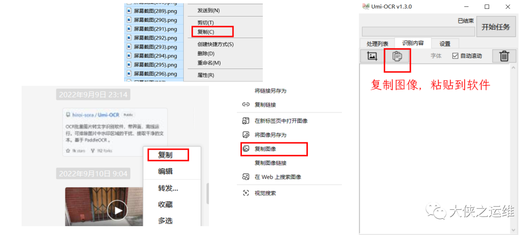 粘贴图片到软件 在任何地方(如文件管理器,网页,微信)复制图片,软件上点击粘贴按钮或快捷键,自动识别