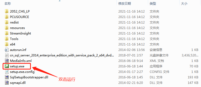 1、下载完毕SQL Server 2014压缩包后解压到本地磁盘生成一个ISO镜像文件,然后再次解压到本地文件夹,在文件夹内找到setup.exe,双击运行;