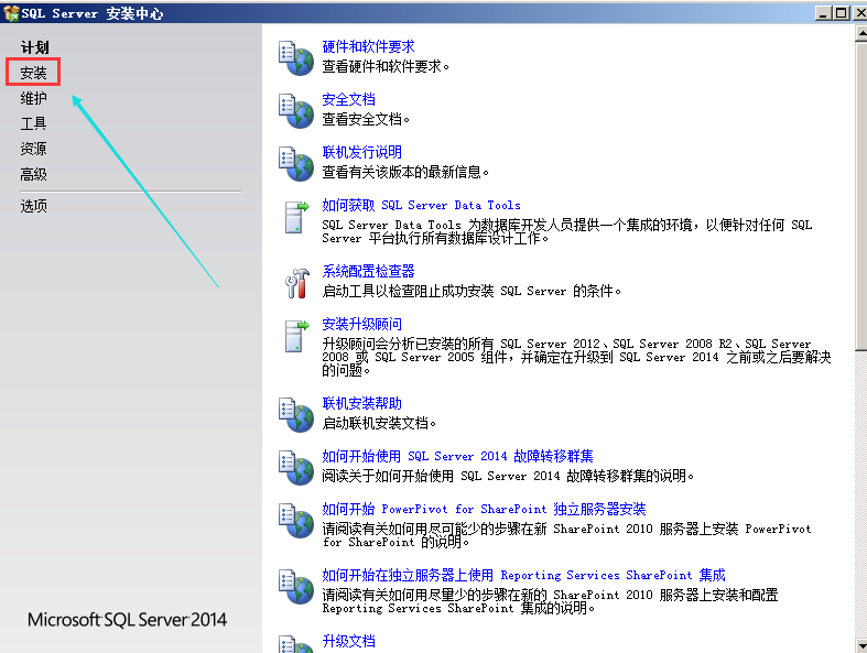 2、点击安装界面左侧“安装”选项,然后点击右侧第一个“全新SQL Server独立安装或向现有安装添加功能”选项;