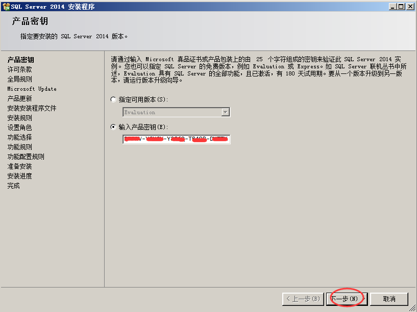 3、输入产品密钥,点击“下一步”;(云盘提供安装包已默认填充密钥)