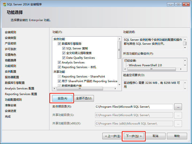 6、点击“全选”所有功能,目录全部默认即可,再点击“下一步”;