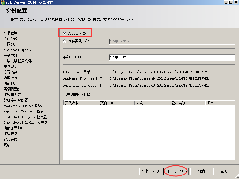 7、选择默认实例(MSSQLSERVER),或自定义实例名称,点击“下一步”;一般情况下默认实例就可以了,除非你电脑上安装了多个数据库,造成了实例的冲突