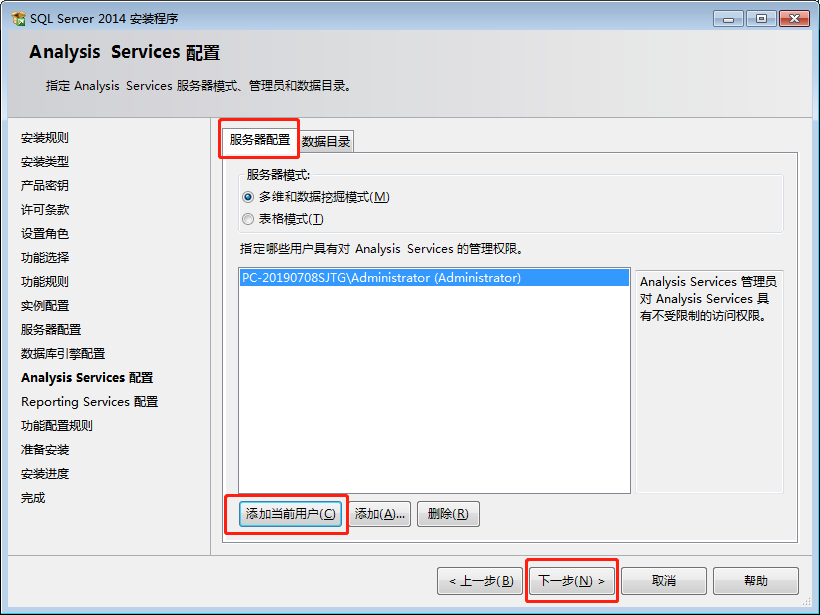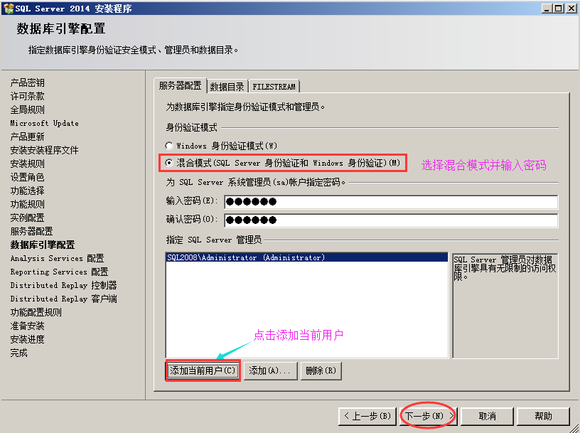 9、选择混合模式并输入sa系统管理员登录密码(密码复杂度有校验,建议输入比较复杂的密码,至少包含数字、英文字符、特殊符号、不少于8位等),不然点击下一步时安装报错,点击“添加当前用户”;