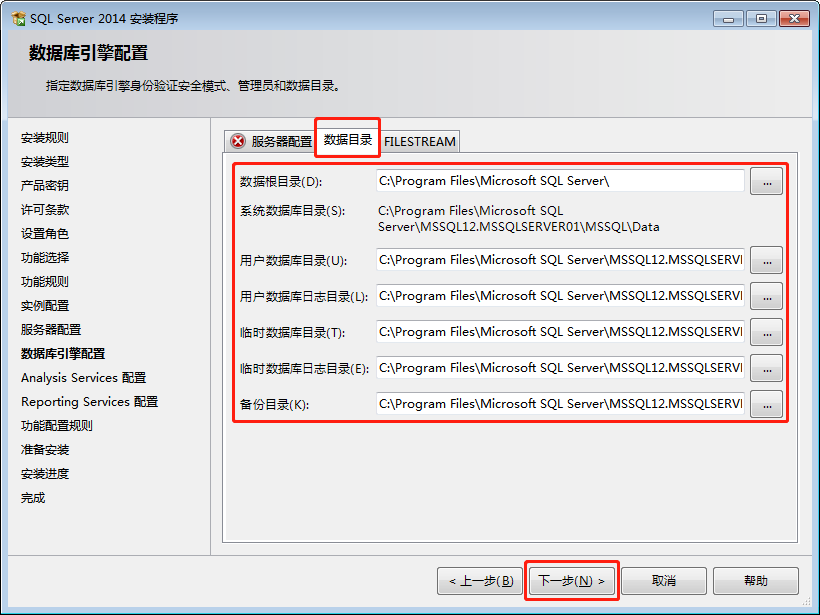 10、单击“数据目录”选项,可查看数据存储位置,也可进行更改,我们现在选择默认就行,(建议直接默认,安装完成后,仍可进数据库设置进行自行调整),点击“下一步”;