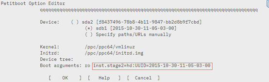 在Boot arguments后面加入以下内容:inst.stage2=hd:UUID=U盘UUID,修改完成后, 选择“OK”保存选项并返回主菜单。