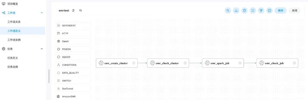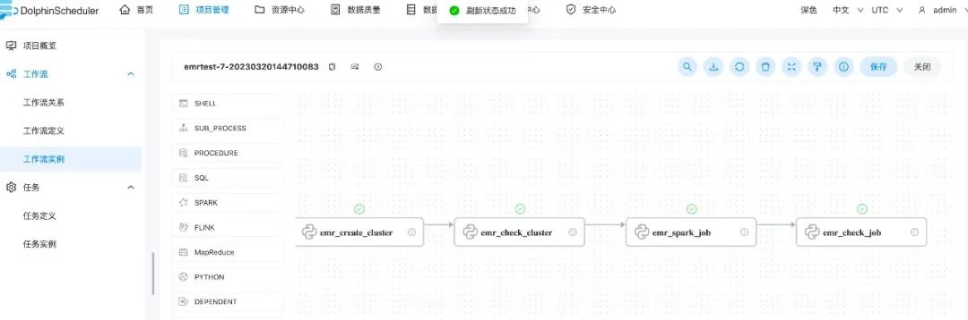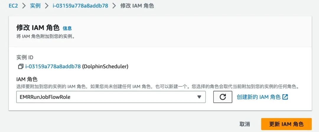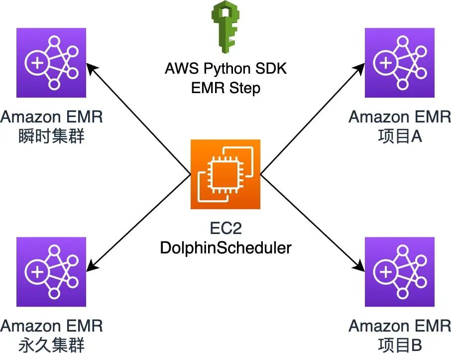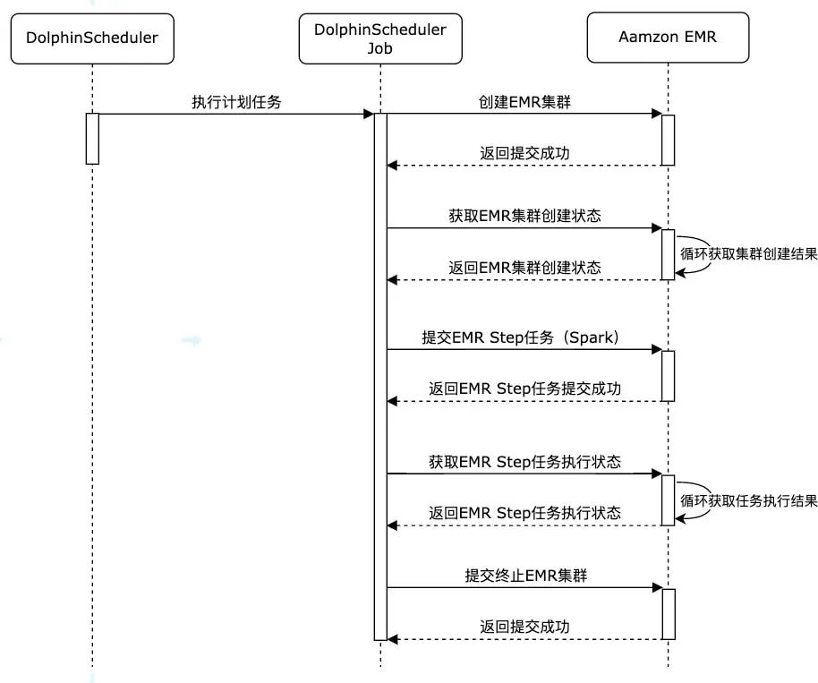 import boto3from datetime import dateimport redisdef run_job_flow():response = client.run_job_flow(Name='create-emrcluster-'+ d1,LogUri='s3://s3bucket/elasticmapreduce/',ReleaseLabel='emr-6.8.0',Instances={'KeepJobFlowAliveWhenNoSteps': False,'TerminationProtected': False,# 替换{Sunbet-id}为你需要部署的子网 id'Ec2SubnetId': '{Sunbet-id}',# 替换{Keypairs-name}为你 ec2 使用密钥对名称'Ec2KeyName': '{Keypairs-name}','InstanceGroups': [{'Name': 'Master','Market': 'ON_DEMAND','InstanceRole': 'MASTER','InstanceType': 'm5.xlarge','InstanceCount': 3,'EbsConfiguration': {'EbsBlockDeviceConfigs': [{'VolumeSpecification': {'VolumeType': 'gp3','SizeInGB': 500},'VolumesPerInstance': 1},],'EbsOptimized': True},},{'Name': 'Core','Market': 'ON_DEMAND','InstanceRole': 'CORE','InstanceType': 'm5.xlarge','InstanceCount': 3,'EbsConfiguration': {'EbsBlockDeviceConfigs': [{'VolumeSpecification': {'VolumeType': 'gp3','SizeInGB': 500},'VolumesPerInstance': 1},],'EbsOptimized': True},}],},Applications=[{'Name': 'Spark'},{'Name': 'Hive'},{'Name': 'Pig'},{'Name': 'Presto'}],Configurations=[{ 'Classification': 'spark-hive-site','Properties': {'hive.metastore.client.factory.class': 'com.amazonaws.glue.catalog.metastore.AWSGlueDataCatalogHiveClientFactory'}},{ 'Classification': 'hive-site','Properties': {'hive.metastore.client.factory.class': 'com.amazonaws.glue.catalog.metastore.AWSGlueDataCatalogHiveClientFactory'}},{ 'Classification': 'presto-connector-hive','Properties': {'hive.metastore.glue.datacatalog.enabled': 'true'}}],JobFlowRole='EMR_EC2_DefaultRole',ServiceRole='EMR_DefaultRole',EbsRootVolumeSize=100,# 集群空闲十分钟自动终止AutoTerminationPolicy={'IdleTimeout': 600})return responseif __name__ == "__main__":today = date.today()d1 = today.strftime("%Y%m%d")# {region}替换为你需要创建 EMR 的 Regionclient = boto3.client('emr',region_name='{region}')# 创建 EMR 集群clusterCreate = run_job_flow()job_id = clusterCreate['JobFlowId']# 使用 redis 来保存信息,作为 DolphinScheduler job step 的参数传递,也可以使用 DolphinScheduler 所使用的 mysql 或者其他方式存储# 替换{redis-endpoint}为你 redis 连接地址pool = redis.ConnectionPool(host='{redis-endpoint}', port=6379, decode_responses=True)r = redis.Redis(connection_pool=pool)r.set('cluster_id_'+d1, job_id)