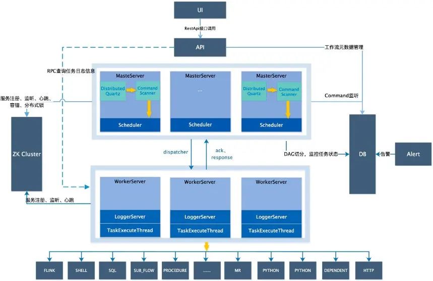 以 DAG 图的方式将 Task 按照任务的依赖关系关联起来,可实时可视化监控任务的运行状态 支持丰富的任务类型:Shell、MR、Spark、SQL(mysql、oceanbase、postgresql、hive、sparksql)、Python、Sub_Process、Procedure 等 支持工作流定时调度、依赖调度、手动调度、手动暂停/停止/恢复,同时支持失败重试/告警、从指定节点恢复失败、Kill 任务等操作 支持工作流优先级、任务优先级及任务的故障转移及任务超时告警/失败 支持工作流全局参数及节点自定义参数设置 支持资源文件的在线上传/下载,管理等,支持在线文件创建、编辑 支持任务日志在线查看及滚动、在线下载日志等 实现集群 HA,通过 Zookeeper 实现 Master 集群和 Worker 集群去中心化 支持对 Master/Worker CPU load,memory,CPU 在线查看 支持工作流运行历史树形/甘特图展示、支持任务状态统计、流程状态统计 支持补数 支持多租户