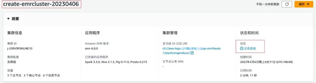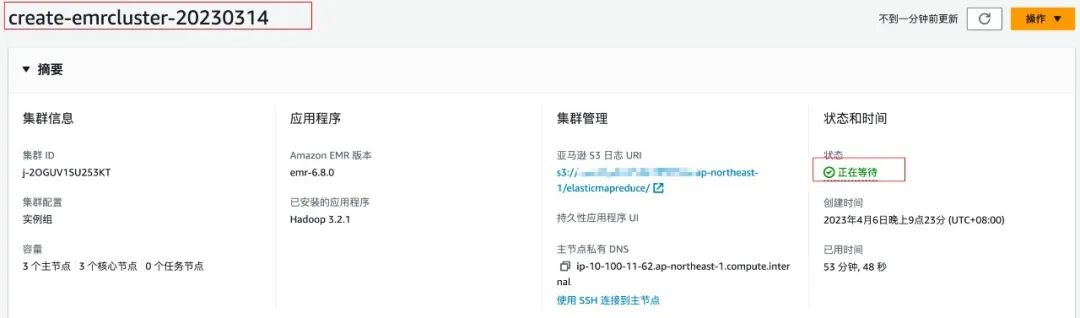 import boto3import redisimport timefrom datetime import dateif __name__ == "__main__":today = date.today()d1 = today.strftime("%Y%m%d")# {region}替换为你需要创建 EMR 的 Regionclient = boto3.client('emr',region_name='{region}')# 替换{redis-endpoint}为你 redis 连接地址pool = redis.ConnectionPool(host='{redis-endpoint}', port=6379, decode_responses=True)r = redis.Redis(connection_pool=pool)# 获取创建的 EMR 集群 idjob_id = r.get('cluster_id_' + d1)print(job_id)while True:result = client.describe_cluster(ClusterId=job_id)emr_state = result['Cluster']['Status']['State']print(emr_state)if emr_state == 'WAITING':# EMR 集群创建成功breakelif emr_state == 'FAILED':# 集群创建失败# do something...breakelse:time.sleep(10)