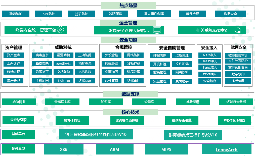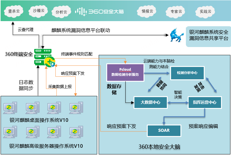 方案在360安全大脑极致赋能下,以云计算、大数据、人工智能等新技术为支撑,以可靠服务为保障,集高级威胁发现(EDR)、防病毒、终端合规管控、终端准入(NAC)、终端审计、主机加固(CWPP)管理于一体,同时与银河麒麟系统安全漏洞信息共享平台紧密协同,可针对银河麒麟操作系统进行更加实时、全面、高效的防护。