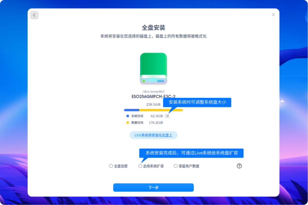 你可以在系统安装过程中自由设置系统盘空间大小,也可以在安装完成后随时进入live模式通过磁盘管理器扩容,再也无需担心系统盘空间不足的问题。