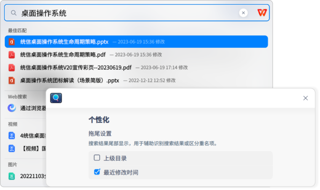 全局搜索结果同名文件太多,分不清?现在搜索结果显示也可以更个性化,通过设置显示文件名后的拖尾属性,比如“最近修改时间”,轻松定位所需文件,再也不用一个一个点开看了。