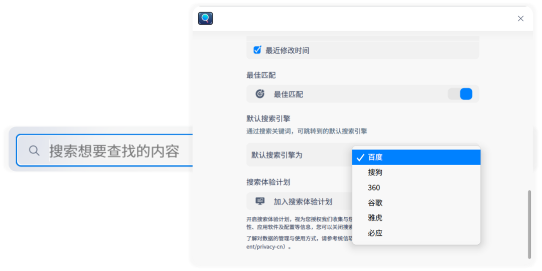 许多国内外用户进行Web搜索时习惯使用自己喜欢的搜索引擎。现在全局搜索支持自定义默认搜索引擎,全球主流搜索引擎任你选择!