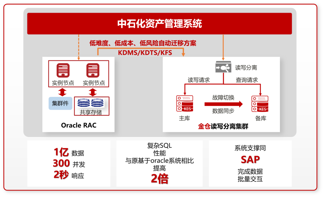 近日,在金仓数据库的支撑下,中石化资产管理系统成功上线,顺利在中石化总部和7家二级企业试点运行,助力中石化各类资产高效管理及优化。随着新一代信息技术的发展,中石化提出信息化“432工程”,聚焦打造“数字化工业生态”和“数字化服务生态”两大体系,全面建成经营管理、生产营运、客户服务、金融资本四大领域应用云,构建起面向实战的可感可控网络安全体系、统一规范的数据治理和信息标准化体系,形成科学完备的信息化管控体系,建成数字化服务平台和基础支撑平台,为中石化各业务板块协同与数字化升级提供有力支撑。资产管理系统是高质量推进中石化信息化“432工程”建设和数字化转型的重要抓手,也是构建战略型集约化财务管控体系的主要建设内容之一,支撑中石化各类资产高效管理及优化,提高资产的使用效率和价值,降低资产的运行成本和风险,支持中石化的战略发展和业务创新。作为数据库领域国家队,人大金仓走学科自主开创、产品自主研发、人才自主培养之路,金仓数据库与Oracle常用功能100%兼容,与MySQL、SQLServer常用功能90%兼容。在此次资产管理系统转型升级过程中,人大金仓提供了成熟的商业化数据库KingbaseES,该产品已在50多个行业的关键应用替换了国外主流数据库,具备强兼容的优势,同时采用了低业务影响的完备的、自动化迁移工具与方案,能够低难度、低成本、低风险,平滑地实现国产数据库迁移。基于金仓数据库与资产管理系统的深度适配,以及金仓对业务场景和方案的持续优化,复杂SQL性能与原基于Oracle RAC系统相比提高2倍,最终确保能够高效、安全、可靠、稳定、便捷地支撑资产管理系统的运行。未来,人大金仓将继续加强研发投入和自主创新,加速推动各行各业自主创新升级与典型场景应用落地,作为基础底座强力支撑数字中国建设过程中各行各业的数字化转型升级,为数字中国建设贡献金仓力量!