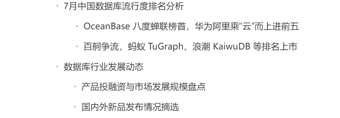 墨天轮7月《中国数据库行业分析报告》已正式发布(点击即可跳转,欢迎大家下载查阅),本期报盘点了墨天轮“中国数据库流行度排行”、产品投融资及新品发布等业内资讯,以此展现当前数据库市场发展前沿动态。
