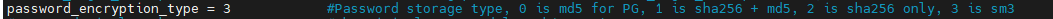 (1)在postgresql.conf文件中配置password_encryption_type=3,并重启数据库使该参数生效,则之后创建的用户将采用SM3算法进行明文密码的加密。