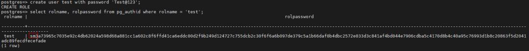 如下示例中,创建了test用户,通过系统表pg_authid的rolpassword字段可以查看用户创建时对应的加密方式,图示即对应SM3加密