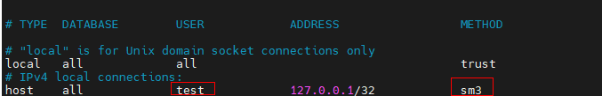(3)在pg_hba.conf文件中配置认证方式为SM3