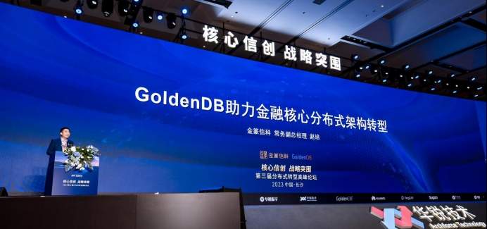 作会为本次议联合主办方,金篆信科常务副总经理赵培发表《GoldenDB助力金融核心分布式架构转型》的主题发言,通过对GoldenDB产品技术架构、关键特性以及在众多代表性金融机构核心业务系统的案例实践,分享助力金融机构分布式转型的经验。
