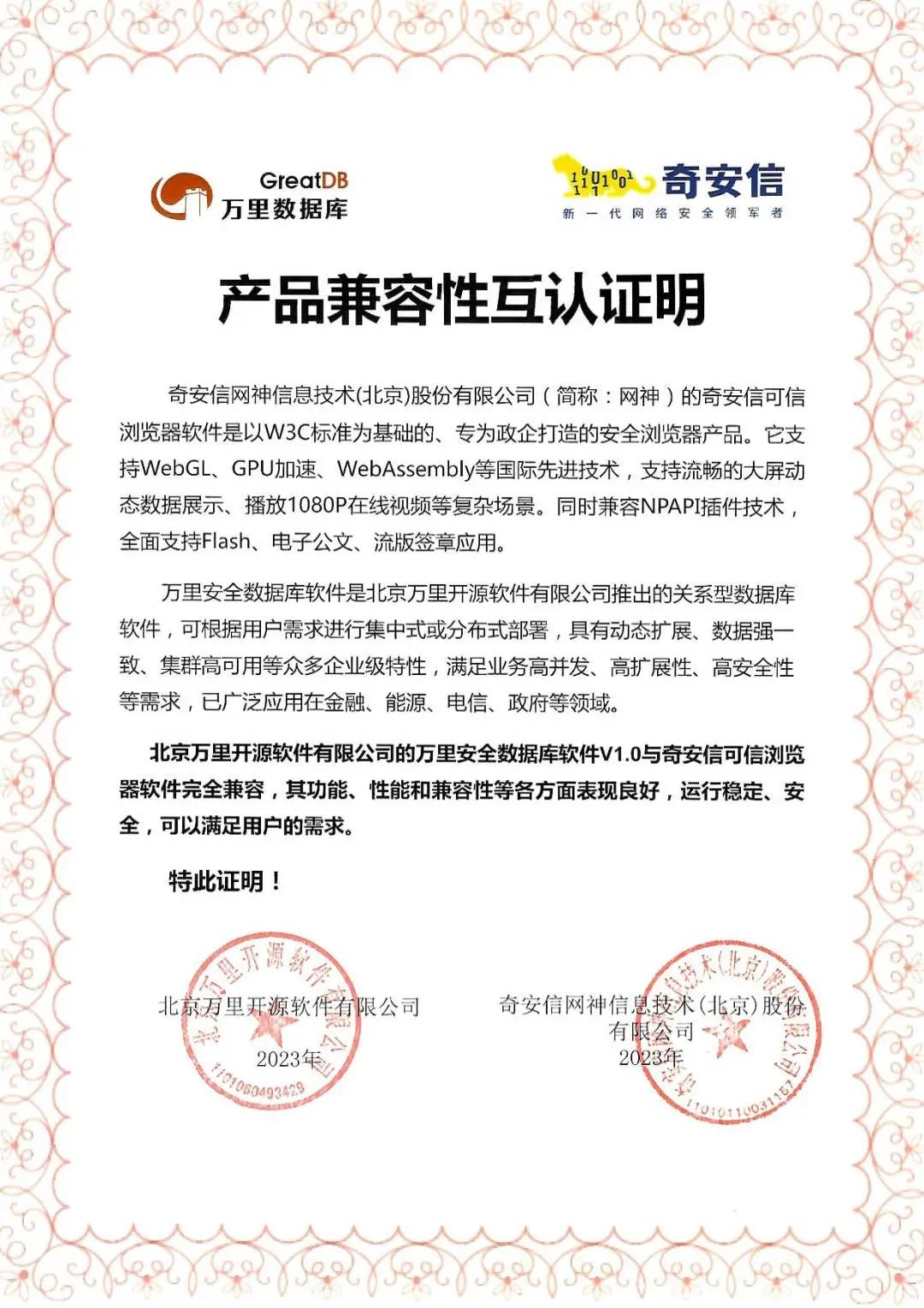目前,万里数据库已与奇安信旗下的可信浏览器V1.0、天警终端安全管理系统V10.0、网神终端安全管理系统V8.0三款产品完成兼容性互认证。双方联合测试得出:产品相互兼容,系统功能运行稳定,产品体验良好。