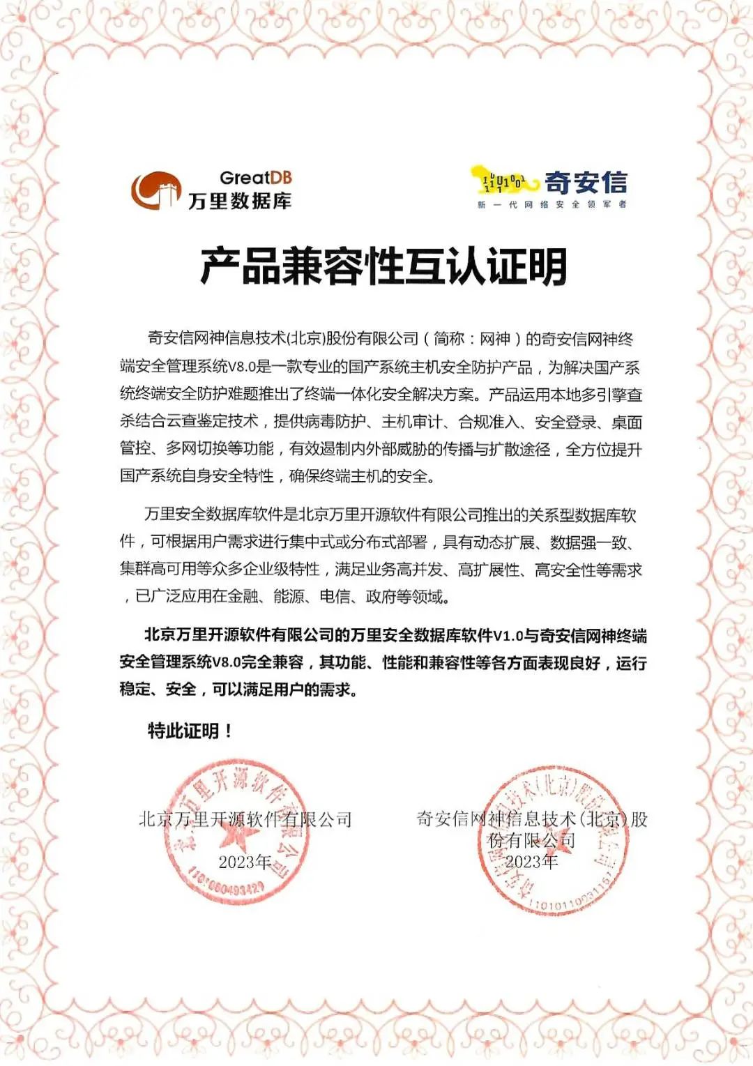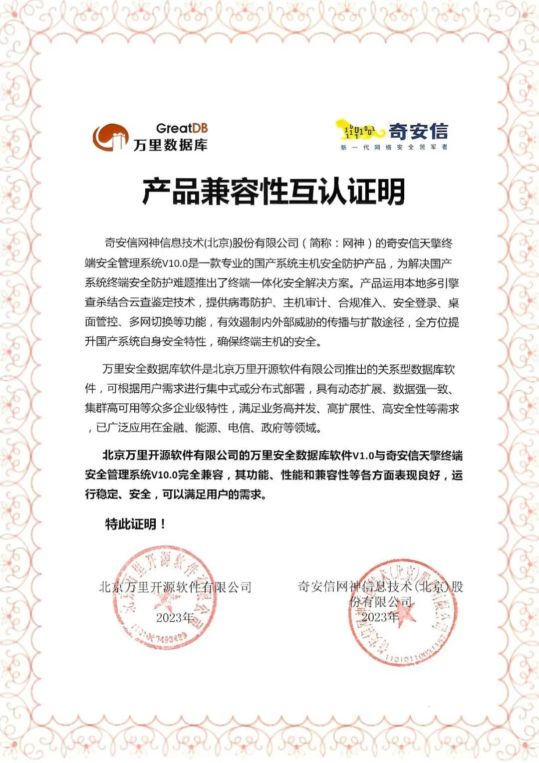 此次兼容互认证,为万里数据库与奇安信后续展开产品解决方案合作提供了技术支撑,有利于满足政企客户对业务及应用的高标准、安全性需求。