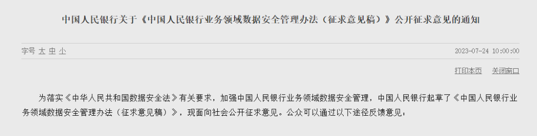 为落实《中华人民共和国数据安全法》有关要求,加强中国人民银行业务领域数据安全管理,中国人民银行起草了《中国人民银行业务领域数据安全管理办法(征求意见稿)》,现面向社会公开征求意见。