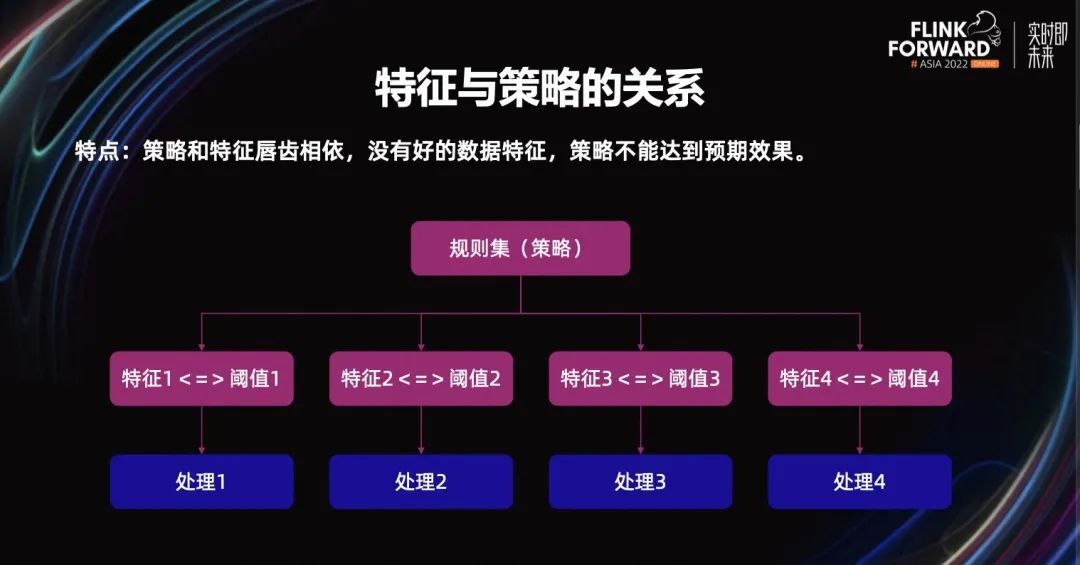 策略和特征是唇齿相依的,没有好的数据特征,我们的策略无法达到预期效果。举一个大家感触都比较深的例子,就是银行卡连续输错三次密码就会被锁卡,或者今天就不能再使用了。这就是一个简单规则型的策略,即特征值达到了某个阈值后,然后进行某一种处理。从这个例子可以看出,特征是整个策略的基石,是非常重要的。