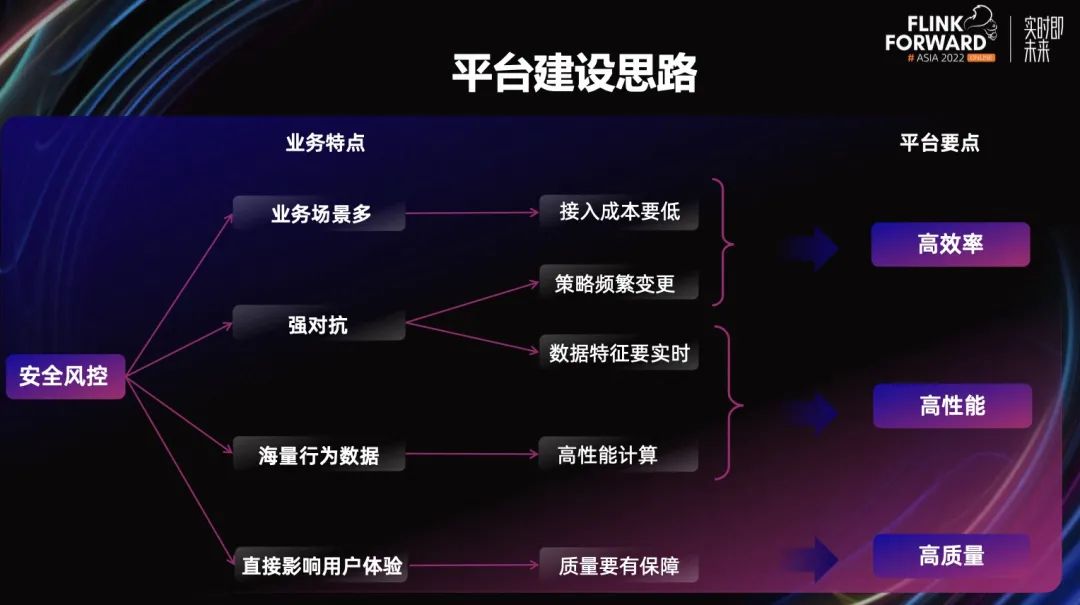 业务场景多:平台接入的成本就要低。 强对抗:策略就会频繁变更,数据特征就要做到实时。 海量的行为数据:需要高性能的计算。 直接影响用户体验:数据质量要有保障。如果数据质量有问题,比如特征算的不准,风控的策略也有可能不准,就会导致误伤或者漏过了一些坏人作恶的行为。