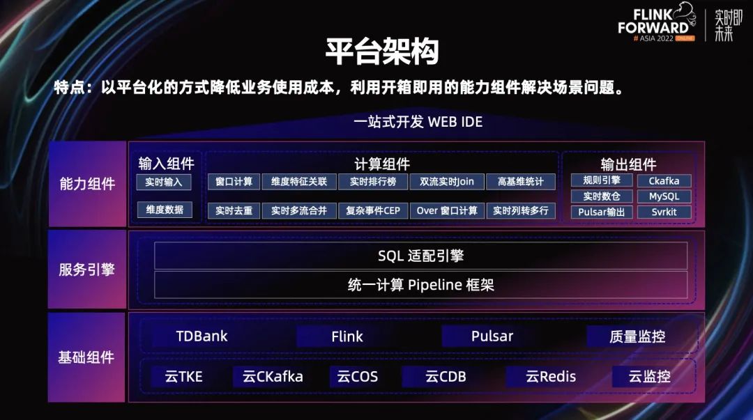 首先我们拥有一站式的 WEB IDE,安全策略人员只需要在我们的 WEB IDE 上就能开发它的特征。同时,我们提供了很多能力组件,比如输入组件有实时输入、维表输入等等。计算组件有窗口计算、维表关联、排行榜、双流 Join、去重等等。通过输出组件可以快速对接到它们的服务里,比如对接到规则引擎、KV 的实时数仓、消息队列、Svrkit(RPC 的一个服务)。