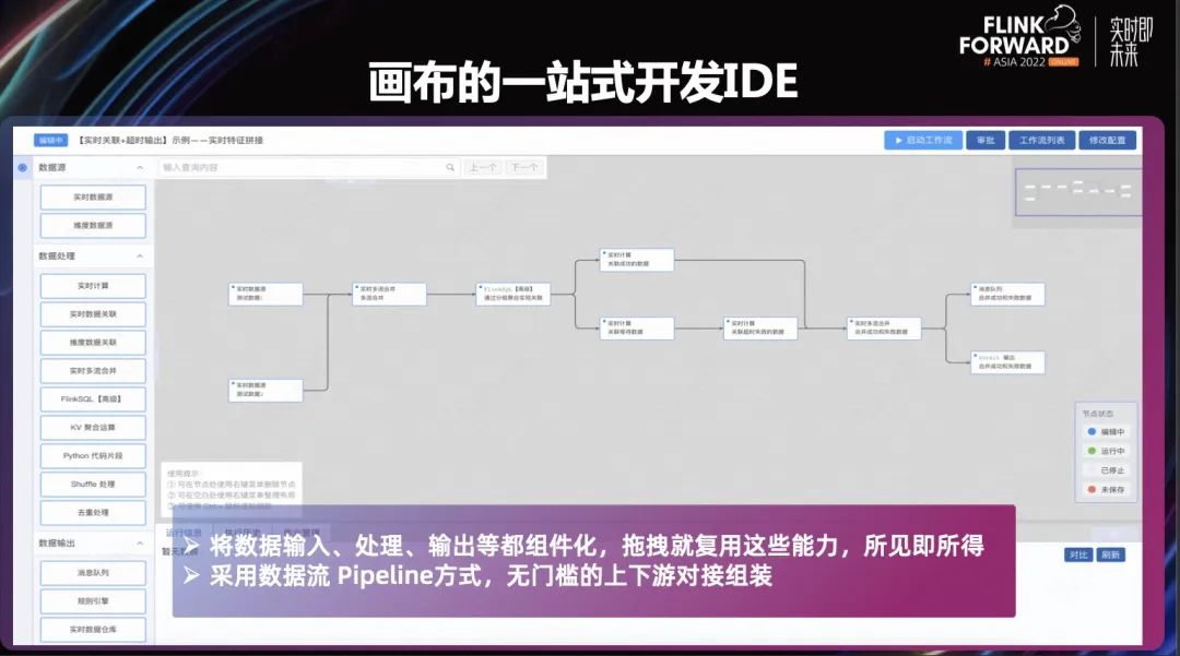 上图展示的是我们画布的一站式开发 IDE。左边是我们的组件,右边是我们的画布。组件包括数据输入、数据处理、数据输出等,用户通过拖拽就能复用这些能力,然后通过简单配置就完成它业务逻辑了。