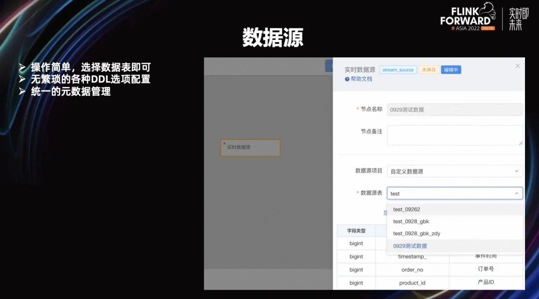 接下来我们来看一下数据源节点,用户只需要再画布上拖入一个数据源节点,然后配置一下就可以了。这里的配置非常简单,只需选择一个数据源表即可。没有繁琐的 DDL 的配置,由统一的元数据进行管理。