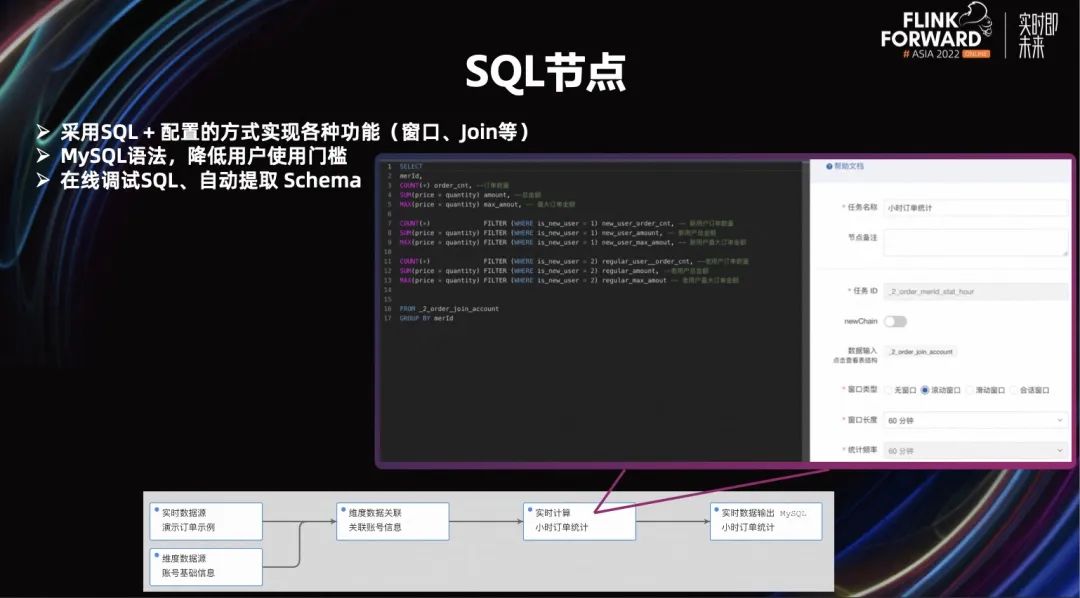 我们的计算节点有很多都是 SQL 节点,但我们的 SQL 节点是采用 SQL+配置化的方式来实现各种功能的,比如窗口、Join 等等。同时,我们还是采用 MySQL 的方式来写 SQL,降低业务的使用门槛,比如用户要写一个窗口统计,它只要按照 MySQL 写一个 group by,然后在右侧设置一下它的窗口就可以了。用户不需要学习流式 SQL 的窗口怎么写,以及窗口函数是怎样的。