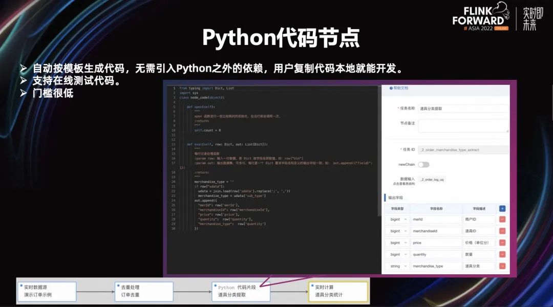 为什么要支持代码片段呢?因为有些数据的结构比较复杂,当我们要去对这些数据做解析的时候,用 SQL 很难实现,这时候只能通过写代码或是写函数的方式来实现。但我们的用户大多都是不熟悉 Flink 的人,所以写代码和写函数对于他们来说门槛就比较高了,因此我们做了 Python 代码片段的节点。