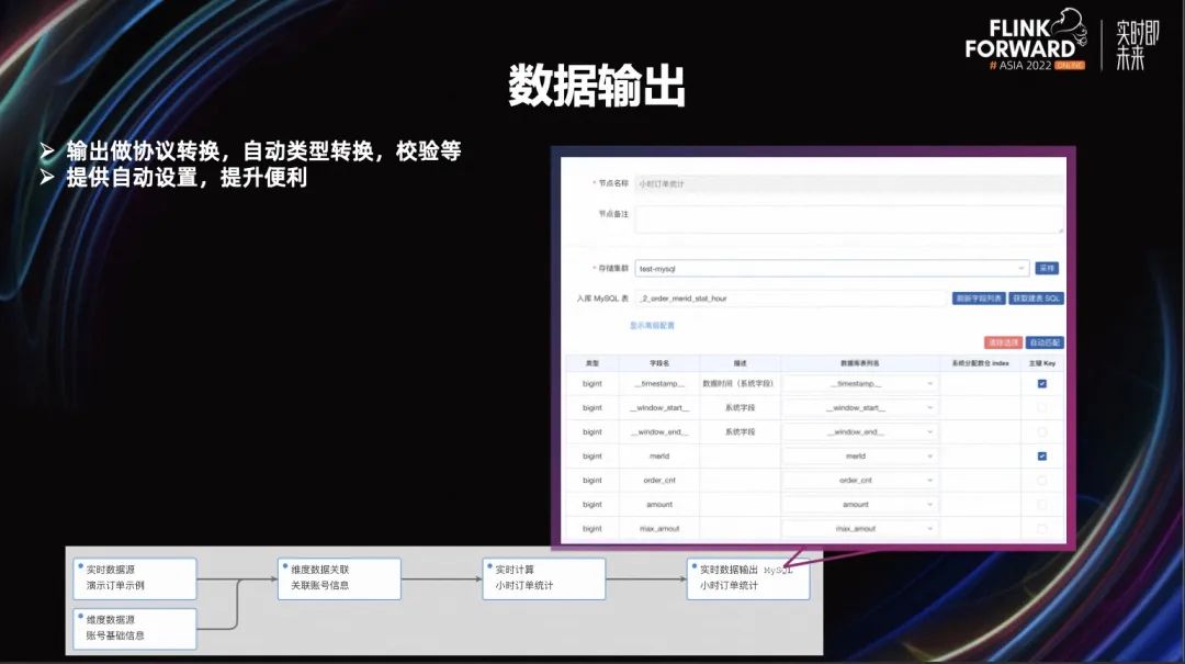 我们的输出节点设置的也比较简单,用户按照他们应用场景选择需要的输出节点,然后拖拽节点进行简单的配置就可以了。我们帮助用户做协议的转换、自动类型的转换、校验等等功能。同时还会提供一些自动化设置的能力,比如用户要输出一个数据到一个 MySQL 表,就会有很多字段需要做映射,如果字段名一样,我们会做一些自动映射,提升他们的效率。