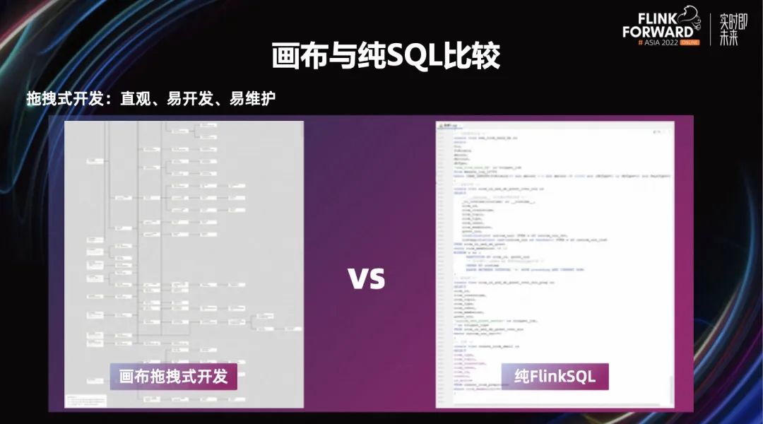 接下来,看一下画布与纯 SQL 比较。我们在使用的时候,觉得拖拽式开发更加直观、易开发、易维护。