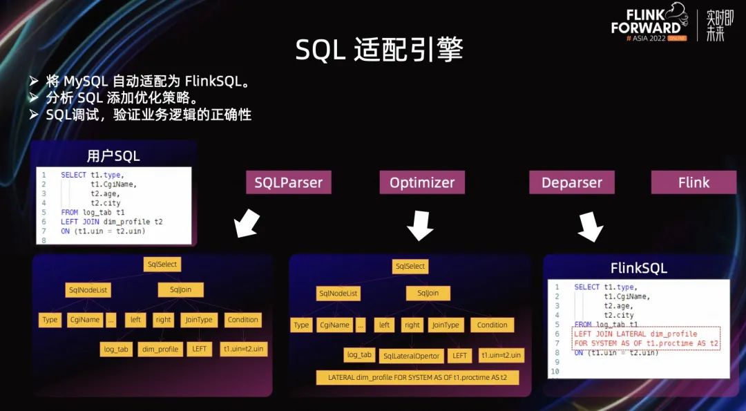 我们看下上图中的例子。如果用户要写一个维表关联,就是 Lookup 计算,那么他只需要按 MySQL 语法写维表关联就行了,即一个 Join 语句。之后我们分析用户的 SQL,哪个是流式表,哪个是为表,然后把 SQL 解析之后再转换成 Flink SQL 到 Flink 里执行。这样用户不需要学习 Flink SQL,门槛会更低。