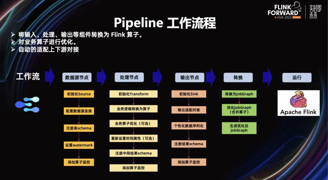 我们的 Pipeline 框架是将输入、处理、输出等组件转换为 Flink 算子,并对业务算子进行一些优化。例如输入节点,用户只需在页面选择即可,框架会帮助用户完成数据源的对接,设置 Schema、Watermark 水位、自动添加数据源的质量监控等等。处理节点也是类似,会帮助用户做很多复杂的事情。